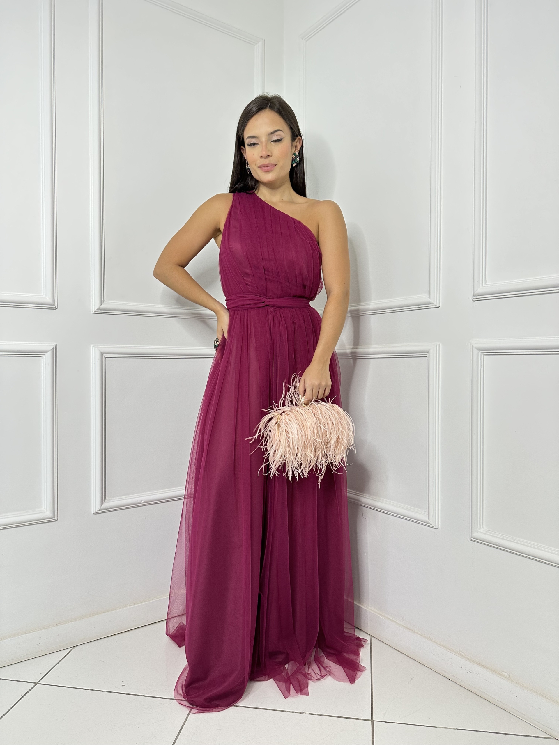 Vestido Tule Fúcsia Um Ombro Só Amarração