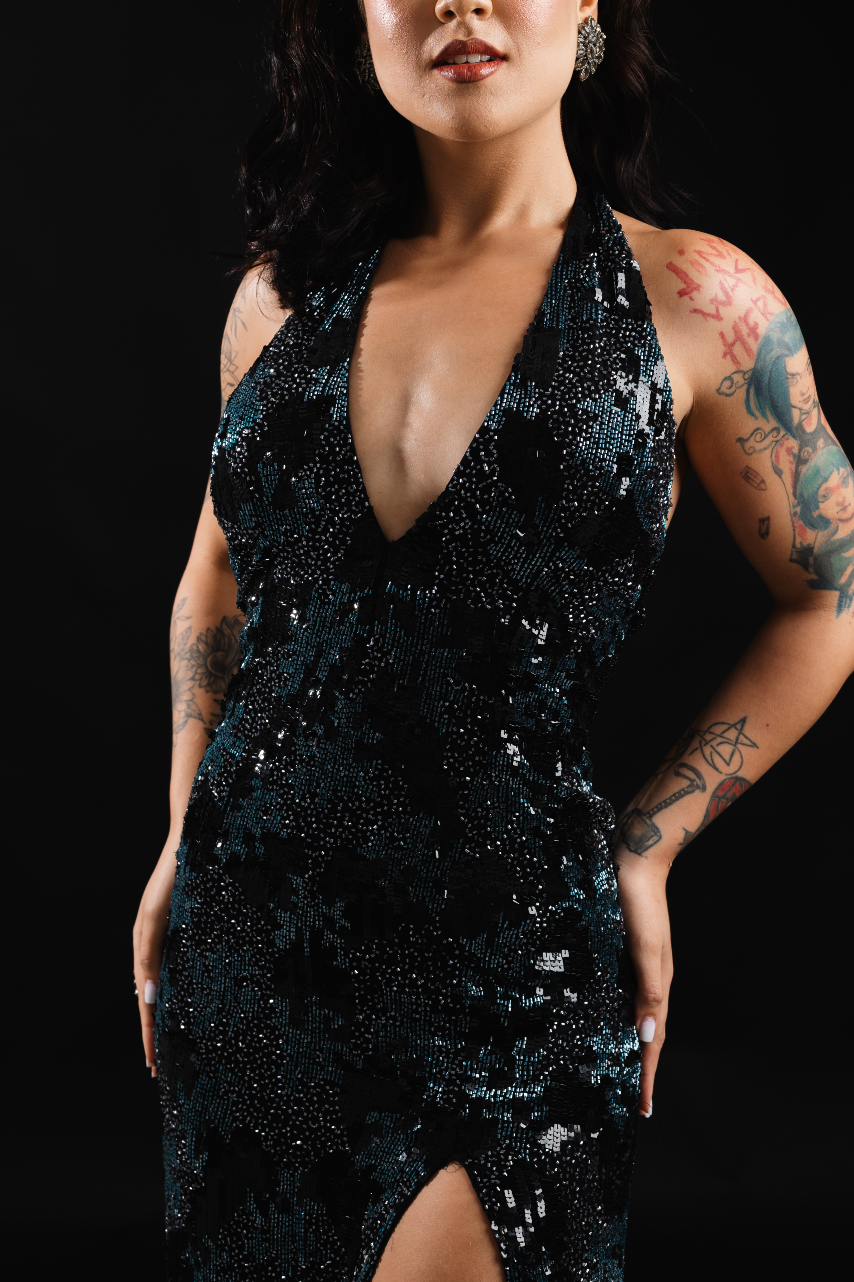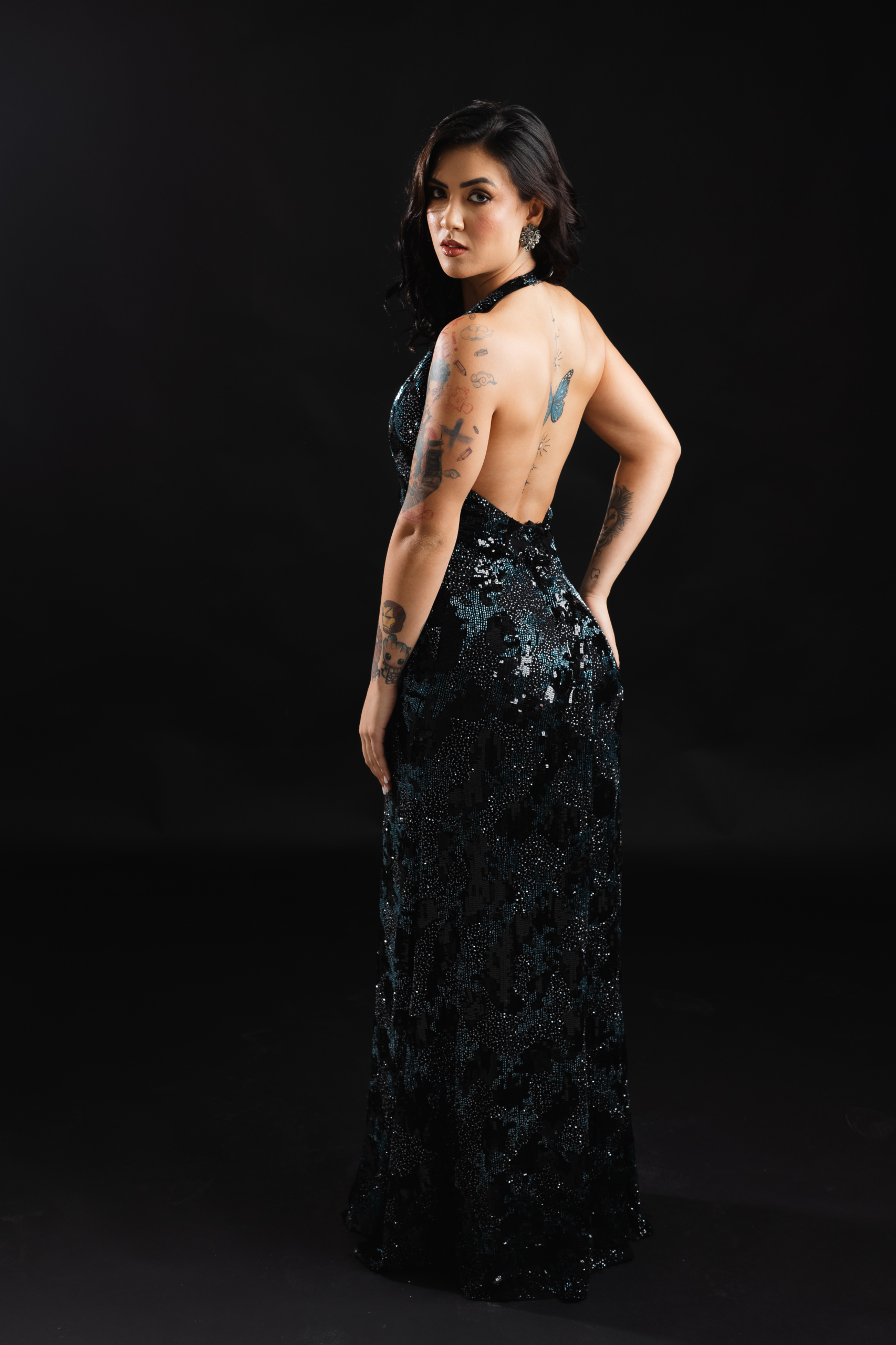 Longo Bordado Frente Única Com Fenda Azul Marinho E Preto