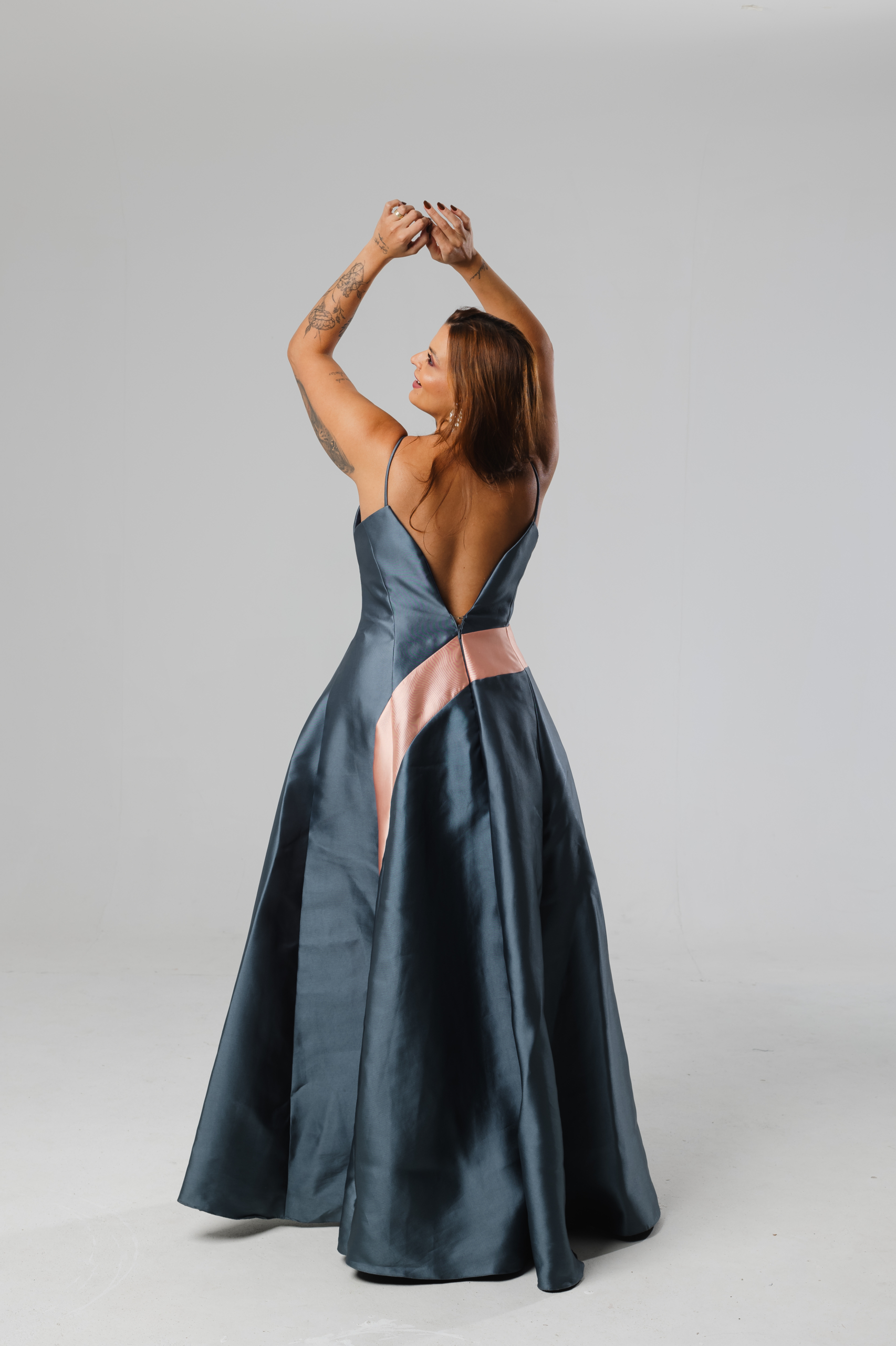 Longo Cinza Com Faixa Rosê Saia Evasê