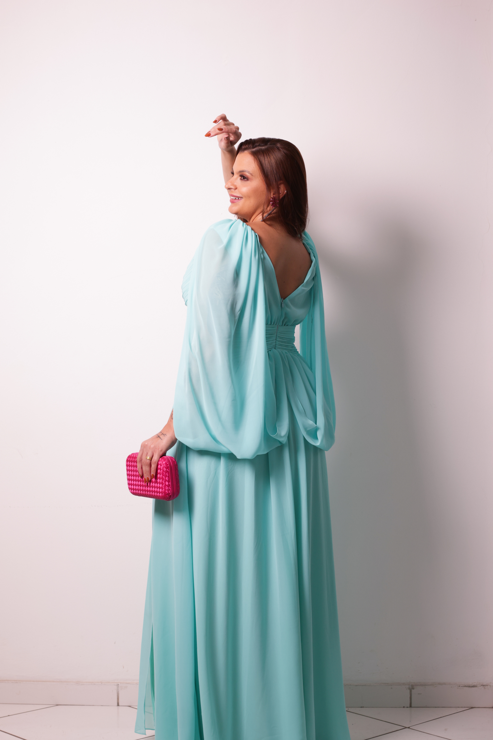 Longo Fluido Tiffany Drapeado Com Capa E Fenda