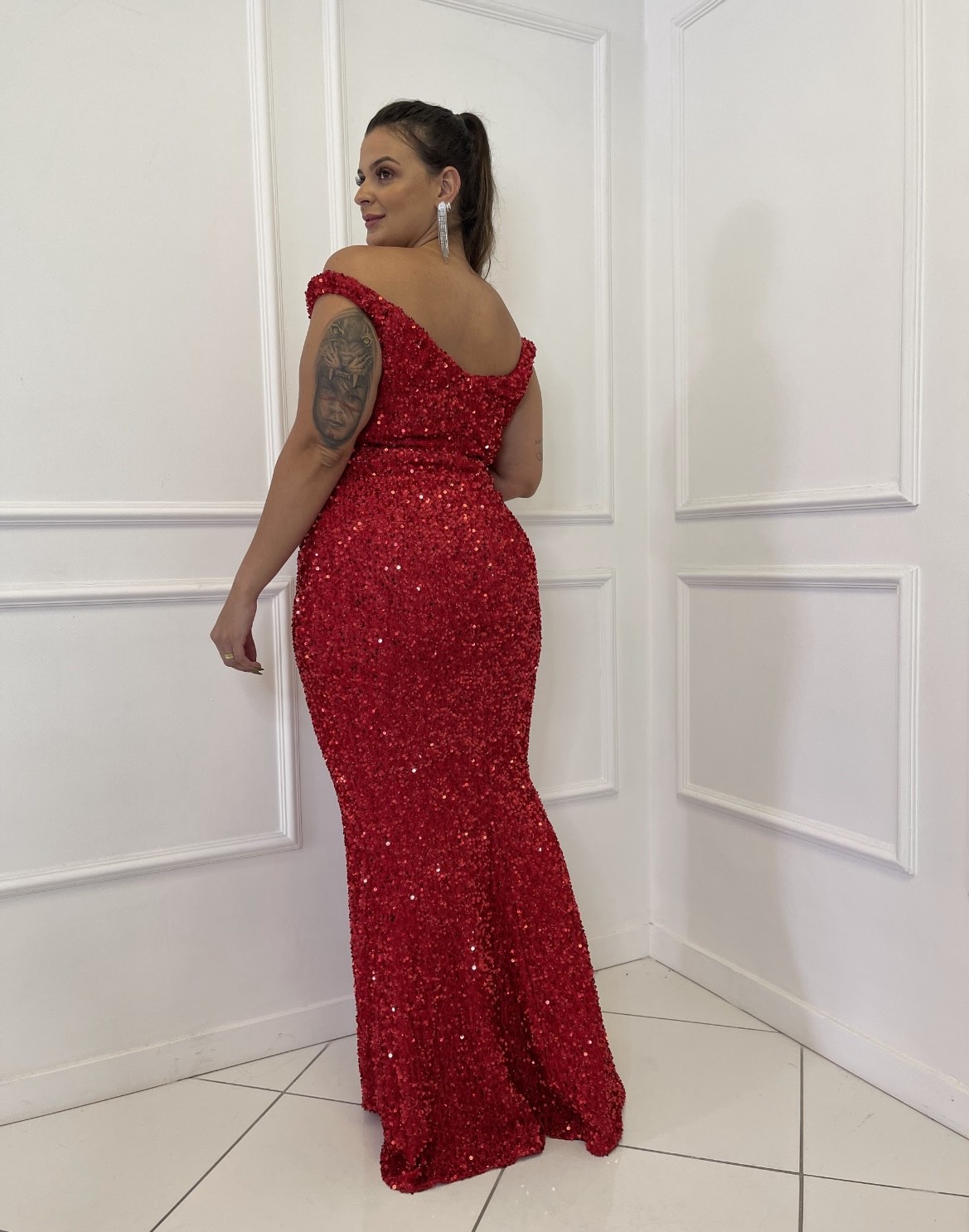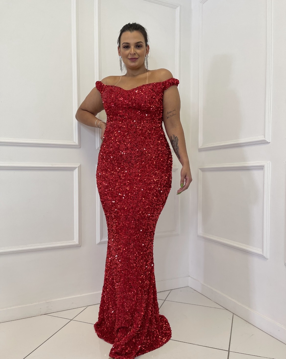 Vestido Vermelho Paetê Ombro a Ombro